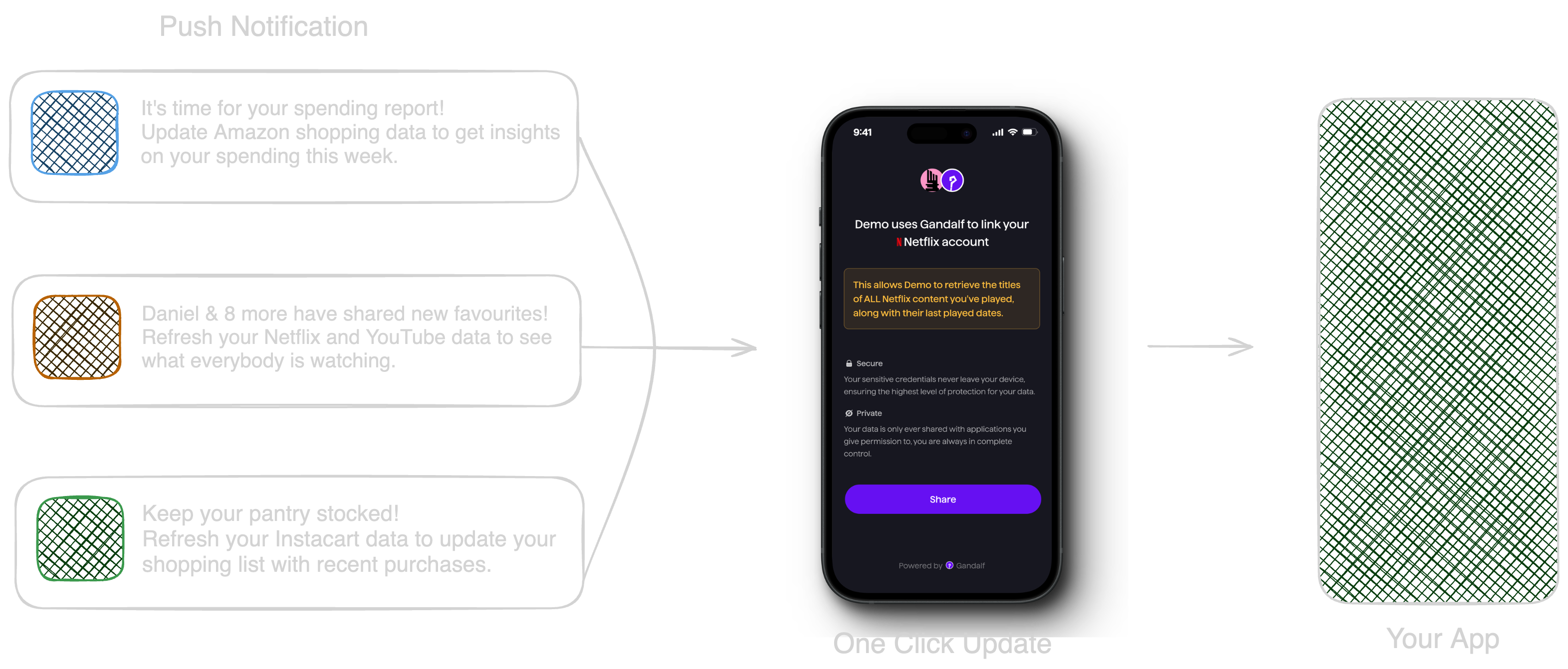 Gandalf uses the Push approach where users actively send their data upon request, in contrast with the Pull method where developers might automatically retrieve data without ongoing user interaction.- End-users directly control when & what data they share. This aligns with data protection laws by requiring user consent + promotes transparency & trust.